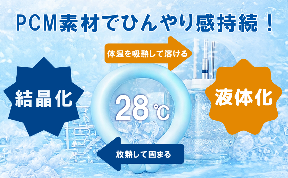 28℃で自然に凍ったり溶けたりする【PCM】を採用したひんやりアイテム。