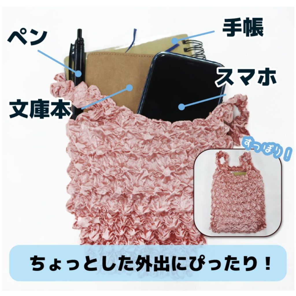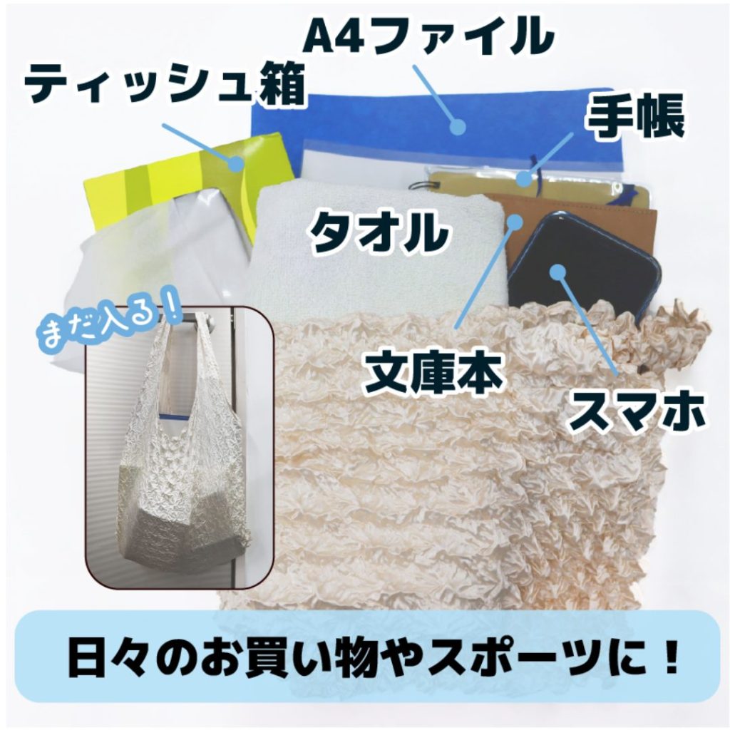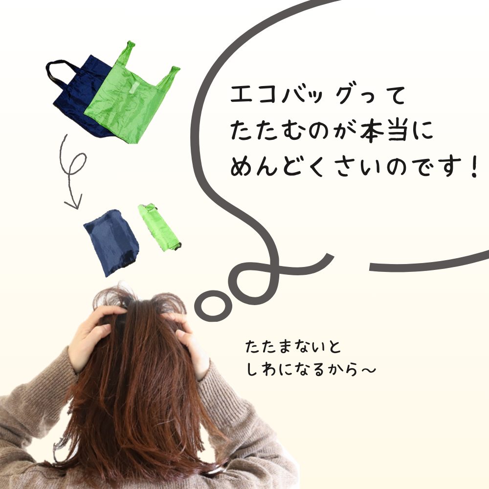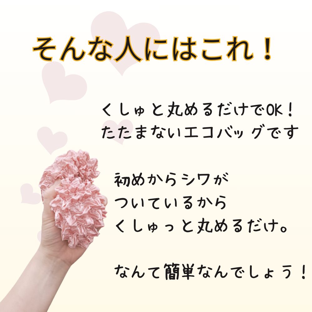 くしゅっと小さくまとまって、カバンの中でも邪魔にならない便利なエコバッグ。